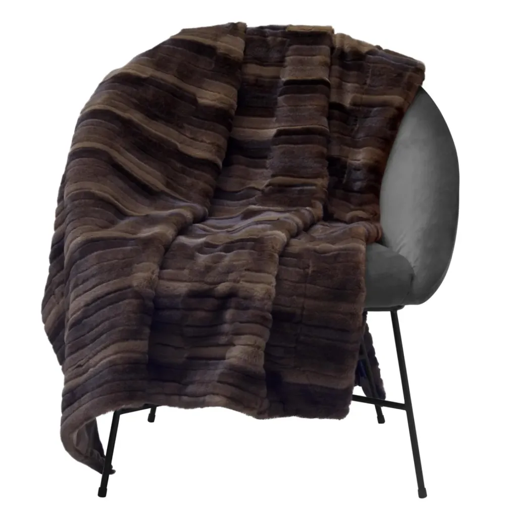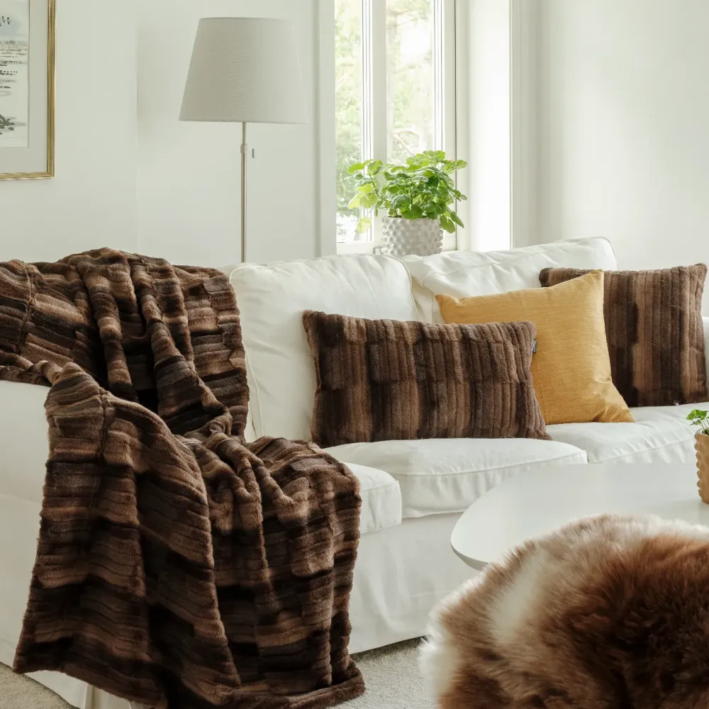 Browny pledd har ren komfort og tidløs stil. Den er laget i et supermykt, nesten mink-lignende materiale som gir en eksklusiv og behagelig følelse. Den delikate teksturen med lett glans og spill i de varme, jordnære bruntonene tilfører dybde og karakter til interiøret – perfekt for både stue og soverom.